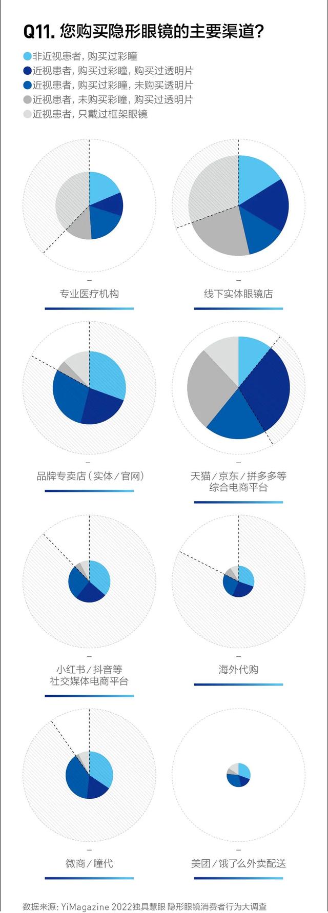 同时购买过彩瞳和透明片的用户,对综合电商平台依赖性最高,而框架眼镜用户仍然以线下实体店为主要渠道。另一值得注意的数据是,彩瞳用户是小红书/抖音等社交媒体平台,以及微商、代购渠道最容易捕获的对象。