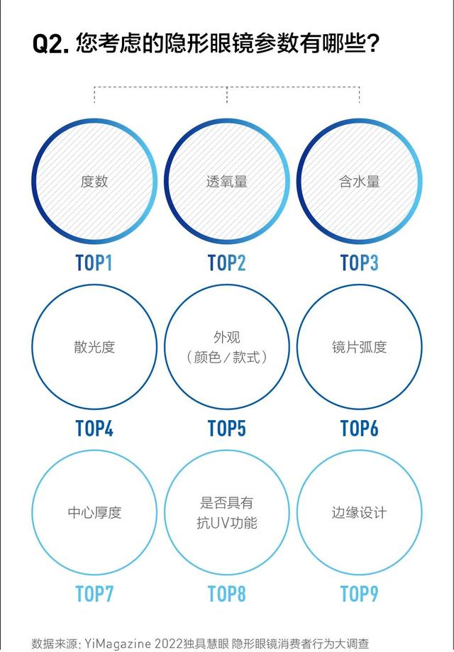 调研显示,消费者购买隐形眼镜时最关注的三个参数是度数、透氧量和含水量,它们也确实是决定隐形眼镜舒适度的关键参数。比如从健康角度来看,就要尽量选择高透氧产品。