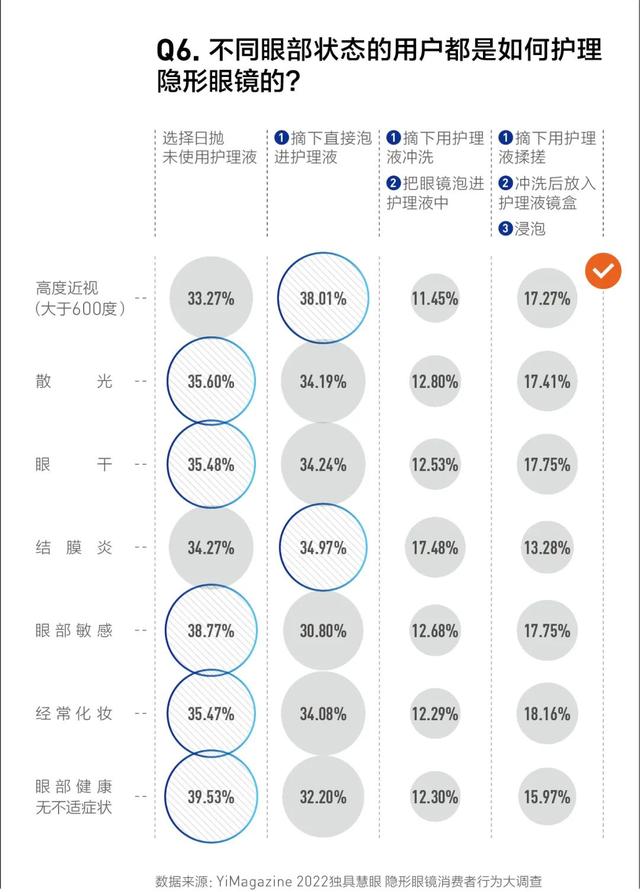 同隐形眼镜一样,消费者对护理液的使用也存在着种种误区。调研显示,无论眼部存在什么问题,护理隐形眼镜时将其直接泡在护理液中的消费者的比例,都远远高于会严格遵循揉搓、冲洗、浸泡流程的人群。