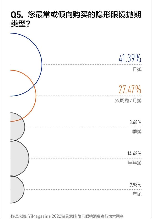 这也是我们很多调研对象的选择:有41.39%的隐形眼镜用户配戴的是日抛,而年抛配戴者仅为7.99%。