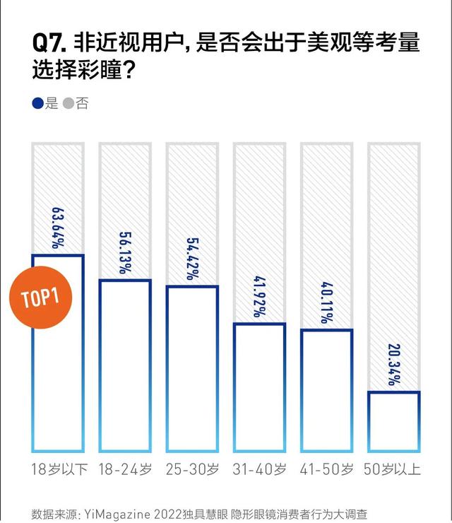 彩色隐形眼镜,也就是我们俗称的“彩瞳”,因具有放大瞳孔、美化双眼的点睛效用,且有0度彩瞳能兼顾非近视人群,所以颇受年轻人的青睐。根据我们的调研,在30岁以下的调研对象中,均有半数以上的非近视人群,会出于美观的考虑选择配戴彩瞳,且彩瞳的受众群体呈年轻化的趋势。