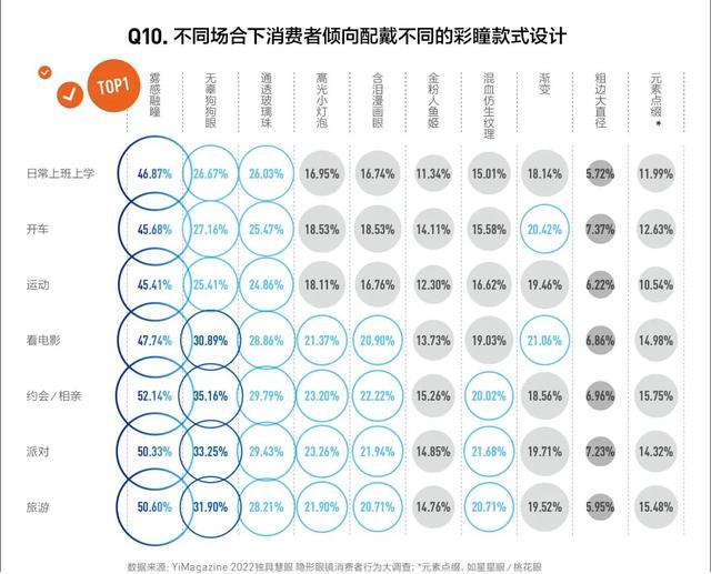 我们的调研显示,边缘有轻微雾感、花式自然的雾感融瞳款式,因为既可以让双眼看起来十分透亮,又不过分夸张,且容易搭配日常妆容甚至能配合素颜,所以高居“喜欢或愿意尝试的彩瞳风格”的榜首。