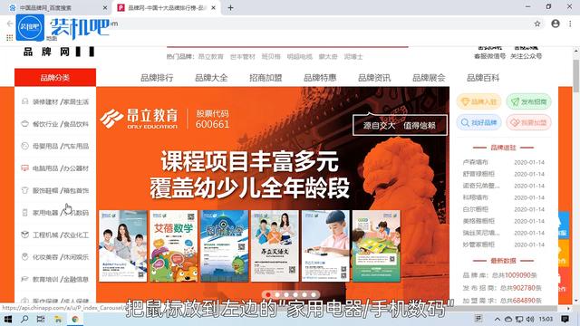 2、进入中国品牌网,将鼠标放到左边的“家用电器/手机数目”栏目。