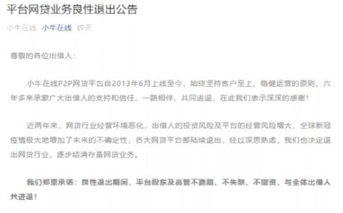 2020年5月9日,小牛在线在其微信公众号发布《平台网贷业务良性退出公告》,称自公告发布之日起,平台将停止发布任何新标及停止计息,并关闭出借人开户、充值、投标等功能;同时,自公告发布之日起,暂缓兑付,待兑付方案经全体出借人公开投票表决通过以后,按照兑付方案启动兑付工作。