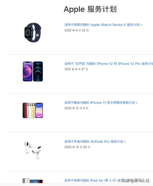 不仅如此,黑马看了一下苹果官网,免费维修的机型还有Apple Watch Series 2 、 Series 3、2015款MacBook等机型。