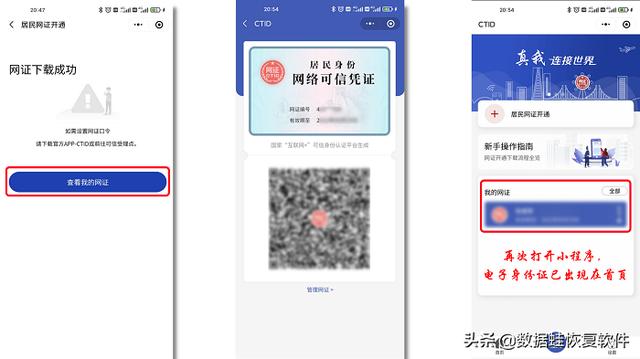 第3步:人脸识别完成后,马上查看我的网证,你的电子身份证二维码就生成了,重新打开首页也可以看到你认证过的都已经下载完成!