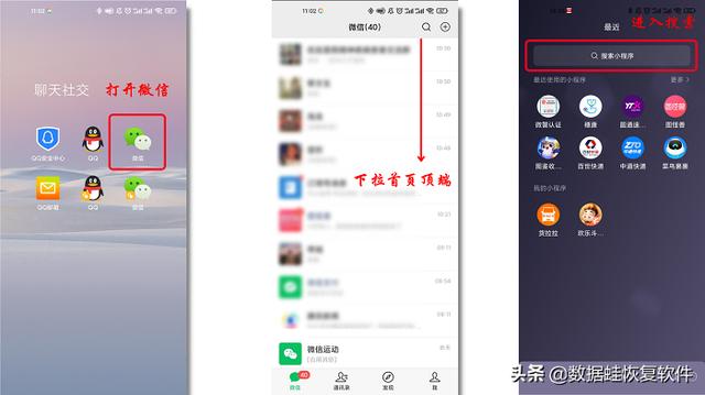 步骤1.打开你的微信(手机端),进入微信的首页,随后下拉你的首页顶部,然后会发现你常用的小程序都显示在这里,我们点击上方搜索框;