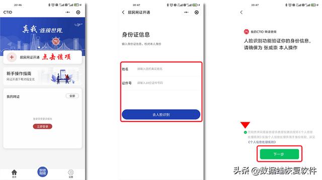 第2步:来到小程序的首页后,第一次我们都是要先进行信息完善的,登录后点击“居民网证开通”,输入自己的姓名及身份证号,进行完人脸识别就OK了!