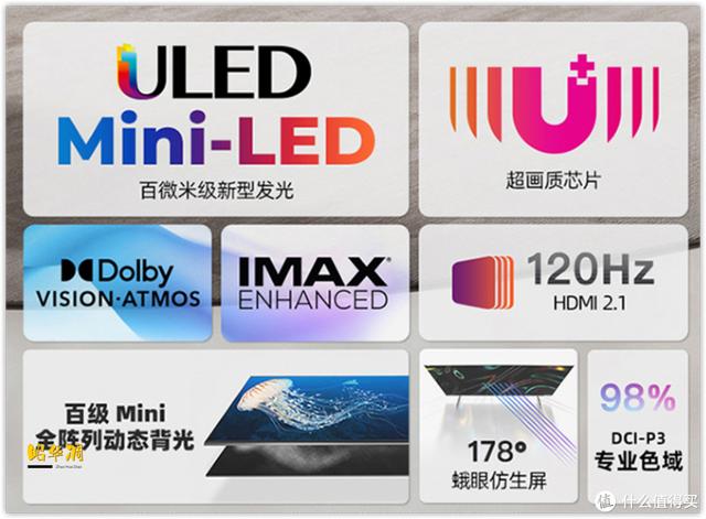 去年发布的新品,55寸、65寸、75寸分别采用了32个、45个、60个背光分区,屏幕峰值亮度达到了700nit,典型亮度提升至400nit,配合锐影光控技术可有效提升画面对比度。金属机身,98% 超高屏占比,94% DCI - P3 广色域、色准 ∆E ≈ 2、杜比 + DTS 双解码,支持 MEMC 运动补偿。
