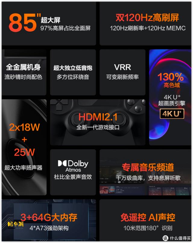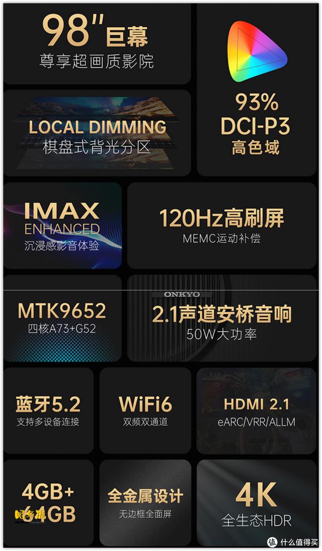 98 吋真4K 软屏,棋盘式背光分区(192个),峰值亮度800尼特,93% DCI - P3 广色域,色彩表现和明暗控制都极为出色。120Hz 屏幕刷新率 + MEMC运动补偿 + HDMI 2.1高速接口 ,运动游戏画面丝滑流畅。硬件配置 A73四核 1.3GHZ处理器,4GB + 64GB 存储组合,支持双频 WiFi6 和 蓝牙5.2,性能到位。对了,这款机型搭载了 2.1 声道安桥音响,通过 DTS - HD认证,音效相当不错。