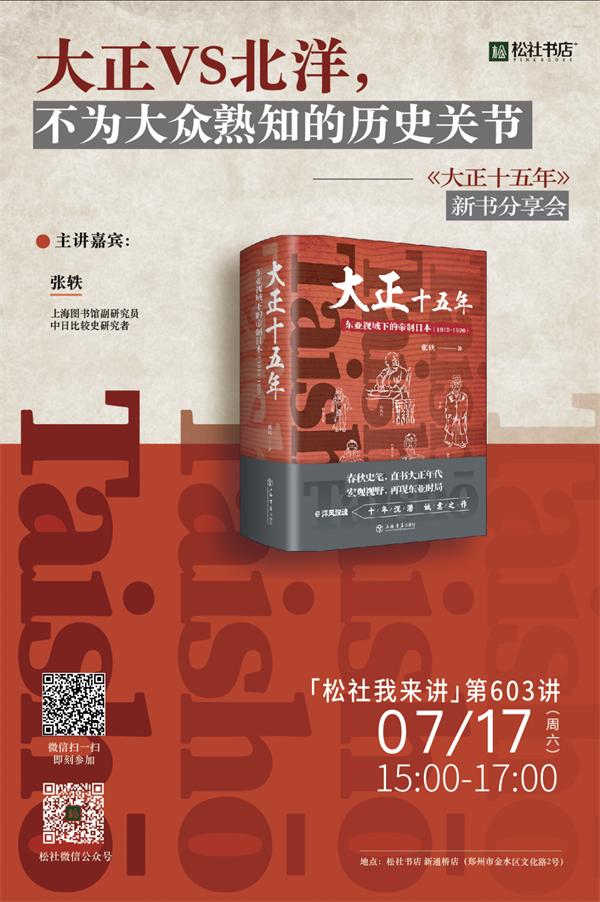 1912-1926年这短短的十五年,在中国是民初,在日本是大正时期。这十五年里,中国历袁氏当国、新旧军阀割据与国民革命;而在日本,老牌藩阀与民间政党势力之间的斗争愈演愈烈,而军部势力在此纷争中渔翁得利,逐渐兴起并于昭和前期上台执政,完成了日本政治近代化过程中一次最重要的蜕变。周六下午,上海图书馆副研究、中日比较史研究者张轶将做客松社书店,与读者分享他的新书《大正十五年》。
