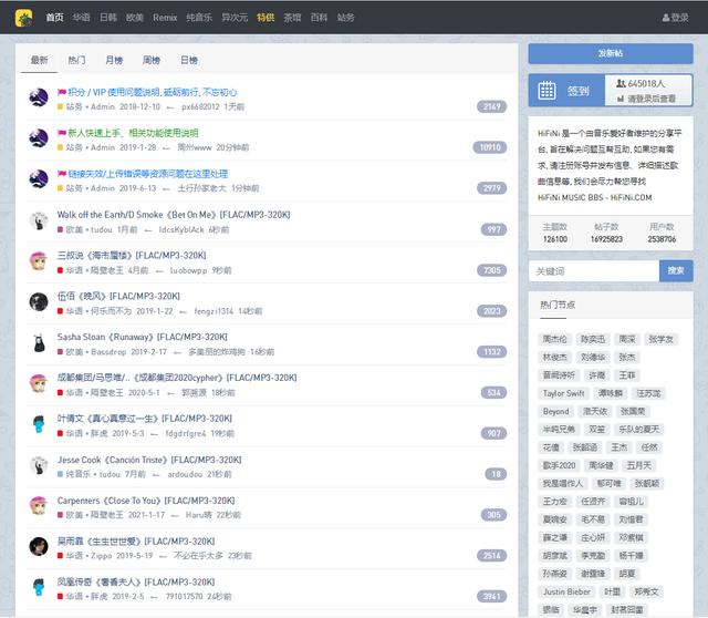 HiFiNi 音乐磁场是一个由音乐爱好者维护的分享平台,这里面的歌曲都是由音乐爱好者们上传的,很多其它平台下架的歌曲在这里也都能找到,可以免费听,但是下载需要注册登录,通过回复帖子获取网盘分享密码即可下载,也有FLAC无损音质。需要注意的是,回复帖子会消耗金币,每天签到都可获得金币,可充值但不建议大家充值(因为我充值过10元1000金币,发现用不完),大家只要坚持签到就好啦~