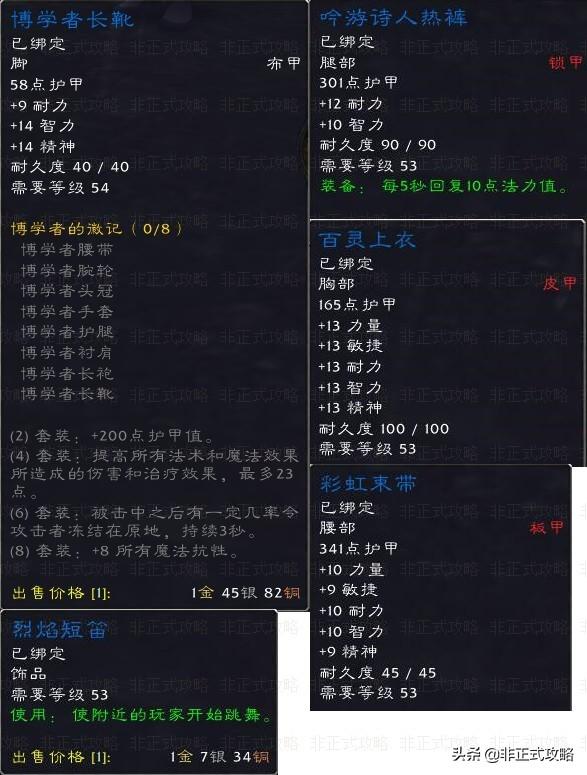 4、弗雷斯特恩(稀有,刷新位置不定):博学者长靴,掉率10.86%。百灵上衣,掉率15.31%。吟游诗人热裤,掉率18.42%。彩虹束带,掉率19.21%。烈焰短笛(有趣的道具),掉率15.13%。