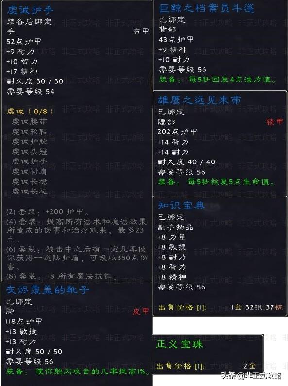 8、档案管理员加尔福特:虔诚护手,掉率12.46%。档案员斗篷(随机前缀),掉率18.45%。灰烬覆盖的靴子,掉率16.30%。远见束带(随机前缀),掉率18.24%。知识宝典,掉率9.87%。正义宝珠,掉率45.41%。(此处有一个系列任务最终奖励银色复仇者,造型是一把蓝色激光剑,详细任务请参考魔兽世界怀旧服,《斯坦索姆》的副本任务攻略)