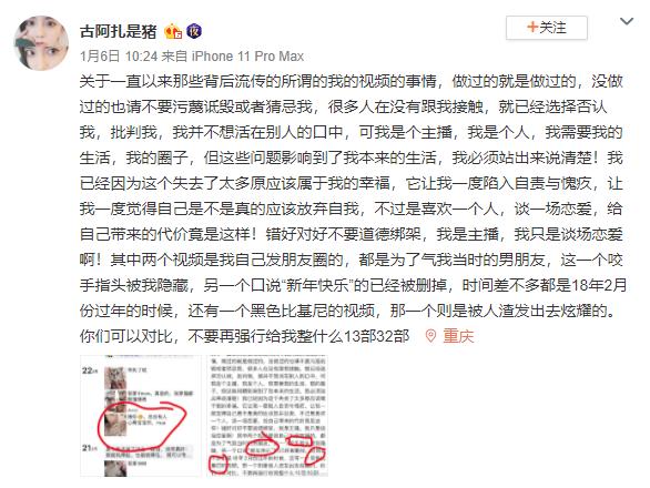 古阿扎表示关于那些流传的视频,有做过的确实有,但没做过的也请大家不要污蔑和诋毁自己,自己也是主播,不应该对自己道德绑架,自己因此付出了惨痛的代价,也请女孩们引以为戒,一定要保护好自己。