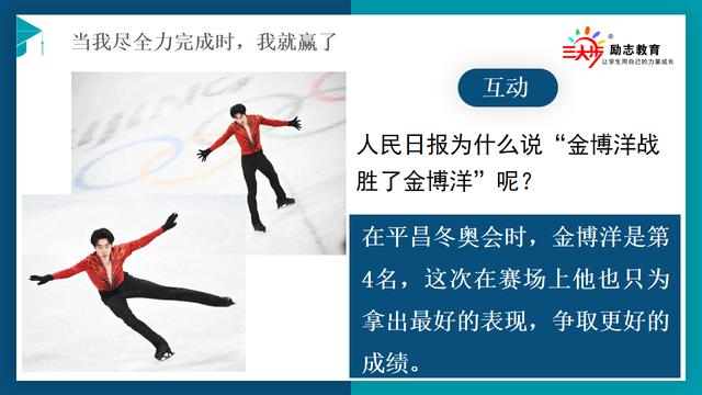 通过讲述冬奥会运动员金博洋是如何战胜了自己,让学生认识到,只需拼尽全力,用最好的状态和心态面对,我们就赢了。