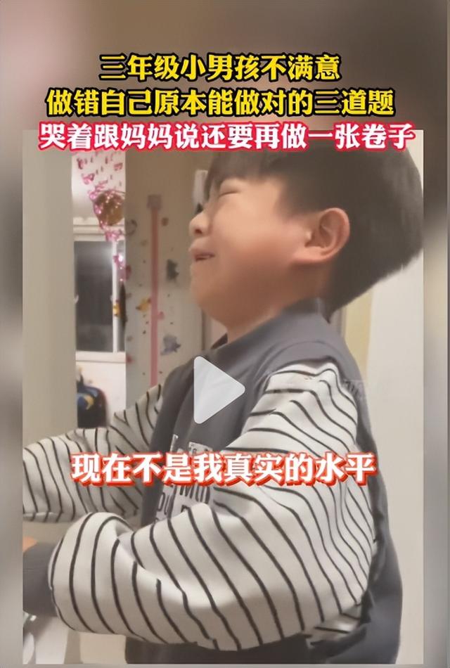 抖音上,一个三年级小男孩因为大意做错了3道题。尽管妈妈一直在旁边开导,也强调已经到了睡觉时间,小男孩依然一边崩溃地跳脚大哭,一边撕掉试卷要求重做一张:“我不!这不是我真实水平,我要重新做!”