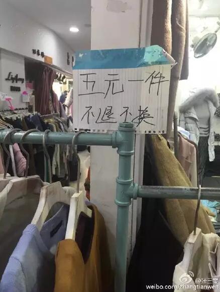网友@张三零昨日中午发微博称,“来四季青!年底的价格太感人了,五块一张!对,花了六百多,买了十几件,包括棉袄六件!东西好,就是人多,男装打折多,但是女装童装最便宜!顺便提醒大家,建议不要开车,堵,没地方停...
