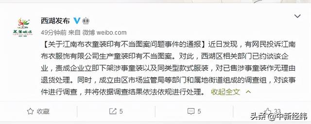 中新经纬9月26日电。26日晚,浙江省杭州市西湖区人民政府新闻办官方微博发布关于江南童装印制不当图案问题的通报。西湖区相关部门已约谈该企业,并对事件进行调查。微博截图报道称,近日发现有网友投诉江南...