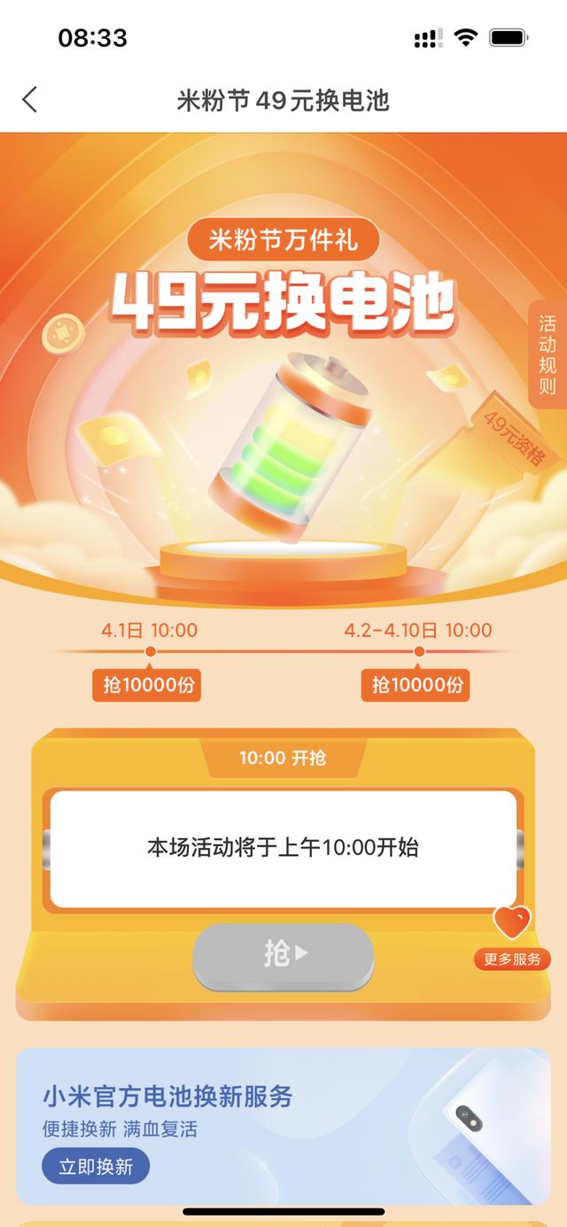 4月1日消息,小米在今日开启了米粉节活动,并且在4月1日到4月10日期间的每天10点开启49元换电池活动的抢购,每一场的持续时间为20分钟。