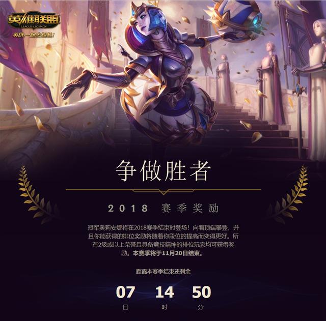 冠军奥莉安娜将在2018赛季结束时登场!向着顶端攀登,并且你能获得的排位奖励将随着你段位的提高而变得更好。所有2级或以上荣誉且具备竞技精神的排位玩家均可获得奖励。本赛季将于11月20日结束。