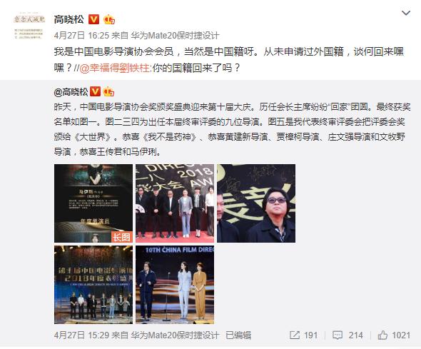 新京报快讯 27日,有网友在高晓松微博留言,问“你的国籍回来了吗?”,高晓松转发并回复道“我是中国电影导演协会会员,当然是中国籍。从未申请过外国籍,谈何回来?”