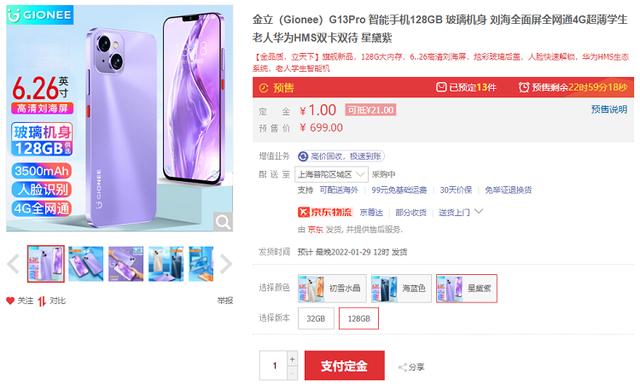 1月29日消息,近期金立手机在京东官方自营旗舰店上架了一款型号为“G13 Pro”的新机。看到这款手机的外观小雷就呆住了,这不是iPhone 13吗?金立G13 Pro的尺寸也只有6.28英寸,和iPho...