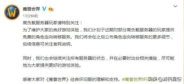 《魔兽世界》怀旧服上线后十分火爆,不少玩家排队,针对这样的问题,官方宣布,计划于近期对部分高负载服务器的玩家提供免费的角色定向转移服务。以下为官方公告:
