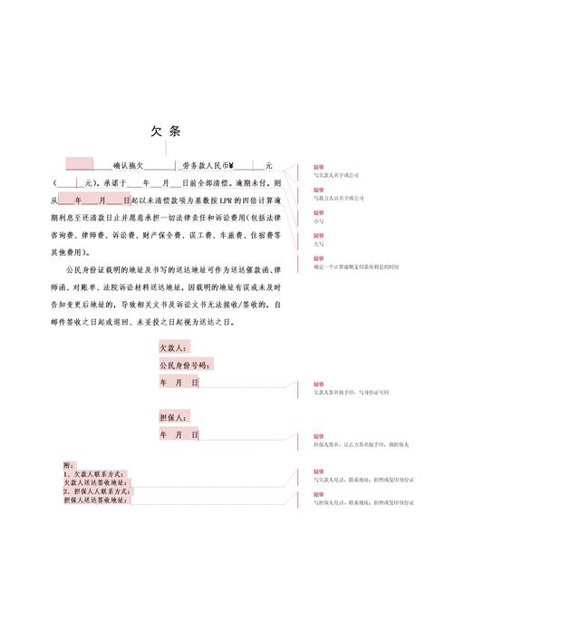 欠条 今借到***人民币***圆整,于*年*月*日前还清, 逾期每年按总金额的*%付给违约金。 借款人:*** *年*月*日 欠据 为 (事由) 欠 (债权人) 人民币 (金额) 元,立此为据。 立据人...