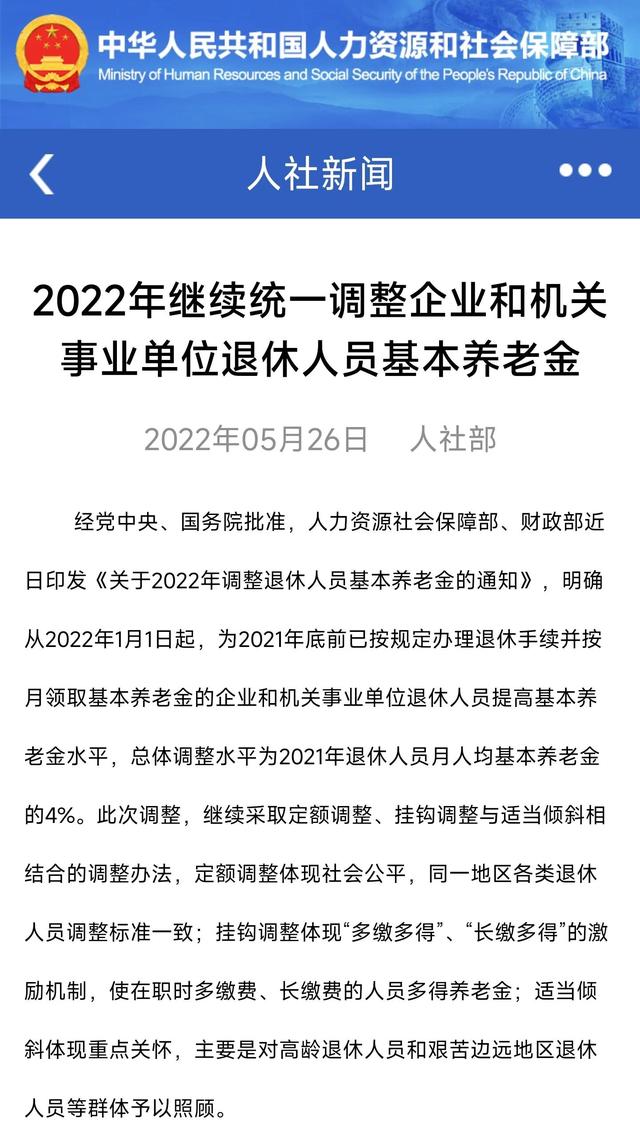 5月26日,人社部公布了《关于2022年调整退休人员基本养老金的通知》,明确今年养老金调整的幅度是“2021年退休人员月人均养老金的4%”。由于以往年度都是在4月中旬公布养老金调整通知,今年这一让退休老人...
